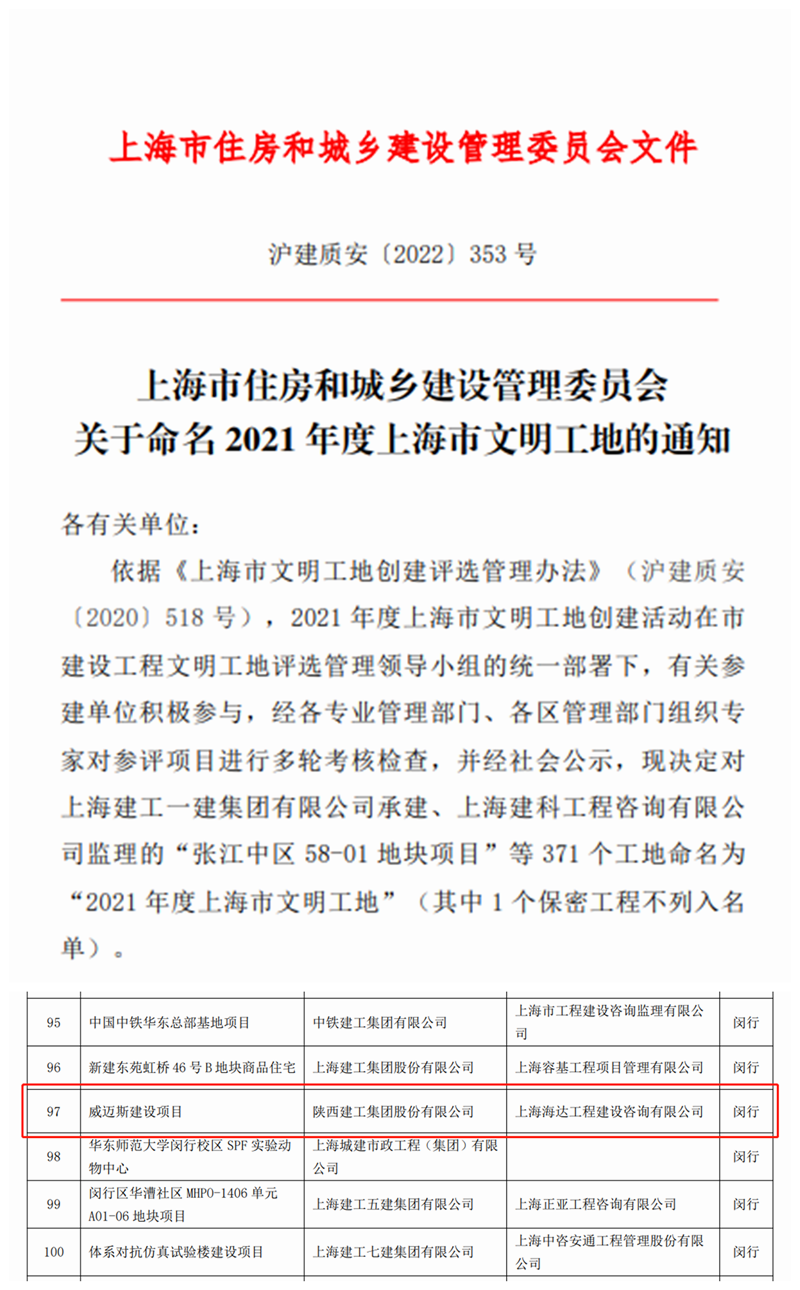 上海市建委近日公布了“2021年度上海市文明工地”名單,我集團(tuán)上海分公司承建的威邁斯建設(shè)項(xiàng)目榜上有名。該項(xiàng)目是集團(tuán)挺進(jìn)長(zhǎng)三角地區(qū)的第一個(gè)項(xiàng)目,首次榮獲上?!吧虾J形拿鞴さ亍狈Q號(hào)不僅為集團(tuán)長(zhǎng)三角市場(chǎng)的開拓樹立了良好形象,而且為集團(tuán)省外建設(shè)項(xiàng)目再添一份榮譽(yù),也為后續(xù)集團(tuán)長(zhǎng)三角項(xiàng)目建設(shè)樹立了榜樣標(biāo)桿。