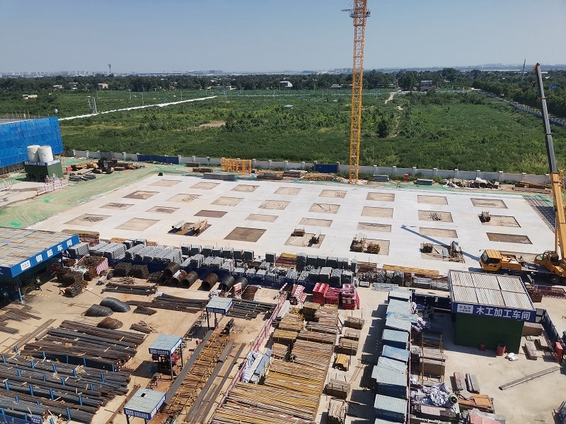 檢測樓從7月5日基坑降板區(qū)開挖到墊層澆筑僅用時(shí)3天,7月8日基礎(chǔ)墊層開始澆筑。基礎(chǔ)采用筏形基礎(chǔ),混凝土強(qiáng)度等級為C35,基礎(chǔ)澆筑方量2645方。