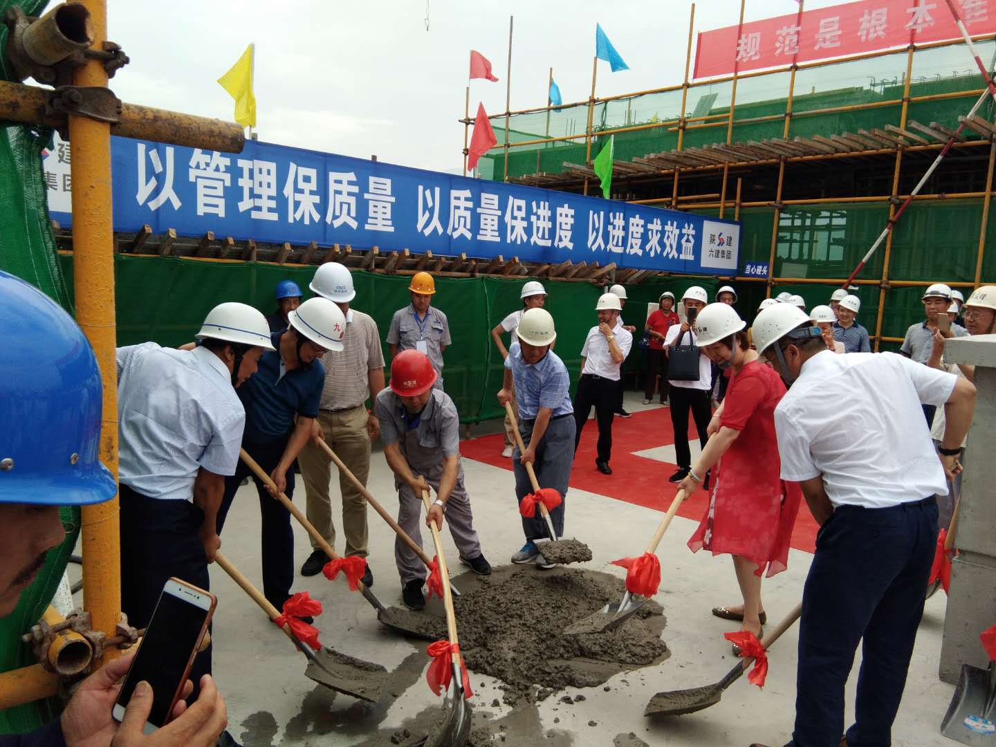 該項(xiàng)目位于陜西省西安市臨潼區(qū)人民東路57號(hào)九〇八大隊(duì)院內(nèi),其中7號(hào)樓建筑規(guī)模294戶住宅,地上21層,地下1層,建筑高度60.15米,建筑總面積40019.61㎡。上午11時(shí),典禮現(xiàn)場(chǎng)裝飾一新,彩旗迎風(fēng)飄揚(yáng),呈現(xiàn)出一派喜慶祥和的景象,封頂儀式在歡快的音樂聲中正式開始,前來參加封頂儀式的各位領(lǐng)導(dǎo)沿著紅毯緩緩步入會(huì)場(chǎng),依次上臺(tái)致辭并共同將混凝土注入預(yù)留方形槽中宣告封頂儀式圓滿成功。