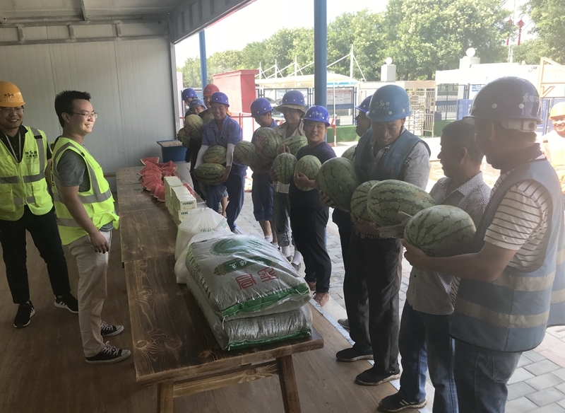 此次“送清涼”慰問為300多名工人送去了消暑降溫用品,共送出西瓜1700余斤、綠豆200斤、白糖100斤,藿香正氣水200盒。項目部工會還成立了送清涼小分隊,每日下午四點由專人在施工現(xiàn)場對管理人員和工人送去冷飲、冰棍等,慰問高溫下作業(yè)的施工人員。